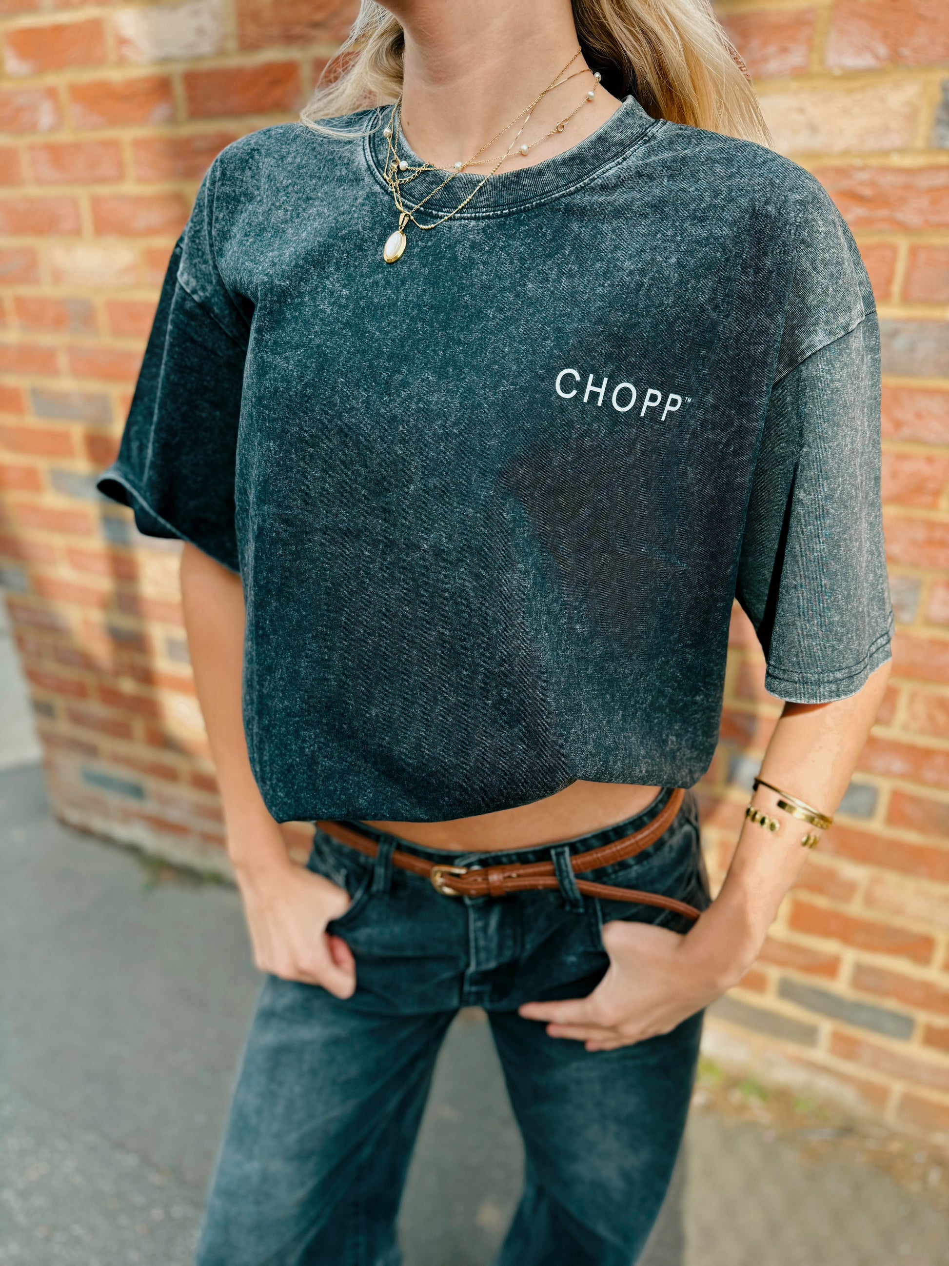 Our new Wave Tee in vintage black carries the Chopp logo on the chest and our signature wave artwork across the back, a nod to where our story began: the ocean. Designed for everyday wear, cut with an oversized fit, and built to look better with age.